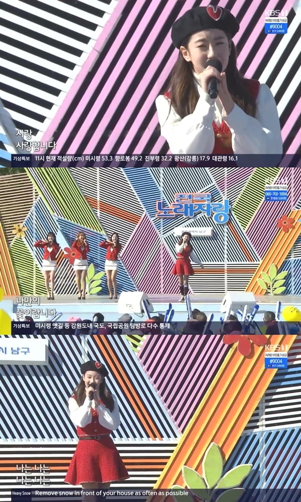오유진은 15일 오후 방송된 KBS 1TV ‘전국노래자랑’ 광주광역시 남구 편에 초대 가수로 출연해 자신의 신곡 ‘사랑 꽃’을 선보였다. 이날 오유진은 레드 컬러의 투 피스 원피스와 하트 와펜으로 포인트를 준 베레모 스타일링으로 사랑스러운 매력을 뽐냈고 곡의 경쾌한 멜로디에 맞춘 시원한 가창력으로 시청자들의 이목을 사로잡았다.