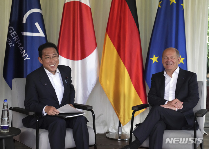 [슐로스=AP/뉴시스]지난해 6월 26일(현지시간) 독일 남부 슐로스 엘마우 성에서 열린 주요 7개국(G7) 정상회의에서 올라프 숄츠 독일 총리(오른쪽)와 기시다 후미오 일본 총리가 별도로 양자 회담을 가지고 있다. 2023.01.17. |