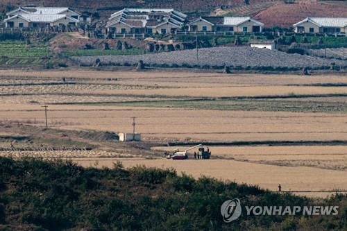 벼 수확하는 북한 주민들 |