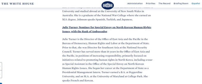 백악관은 23일(현지시각) 홈페이지를 통해 줄리 터너 북한인권특사 지명 소식을 전했다.