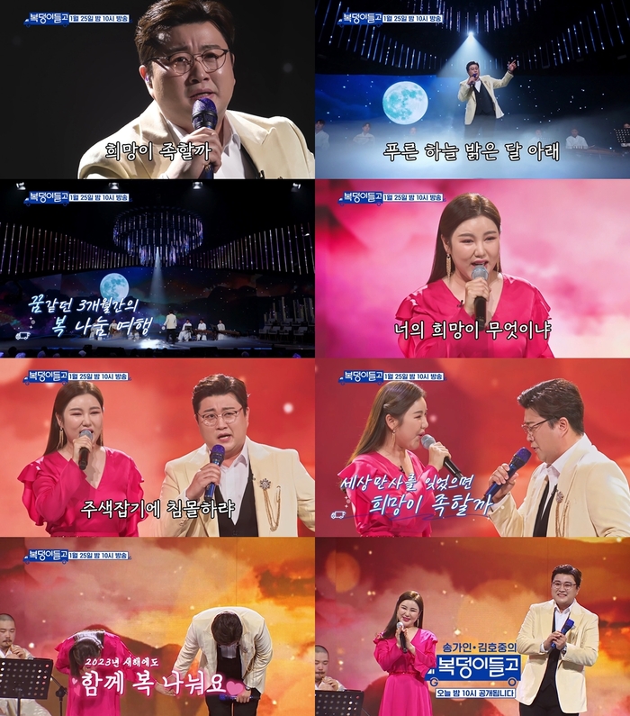 25일 방송되는 TV CHOSUN ‘복덩이들고(GO)’ 마지막회에서는 송가인, 김호중이 복을 나누며 만났던 사람들의 다양한 이야기와 홈페이지를 통해 받은 소중한 사연에 보답하고자 역조공 프로젝트 대장정의 마침표, ‘복 콘서트’를 개최한다.