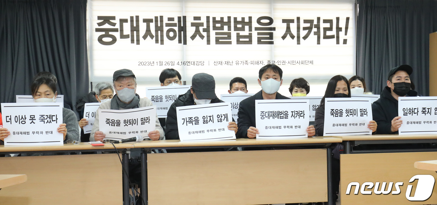 (서울=뉴스1) 송원영 기자 = 26일 오후 서울 종로구 4.16연대 강당에서 열린 중대재해처벌법 무력화 반대를 위한 산재·재난 유가족·피해자 및 종교·인권·시민사회단체 기자회견에서 참석자들이 손피켓을 들고 있다. 2023.1.26/뉴스1