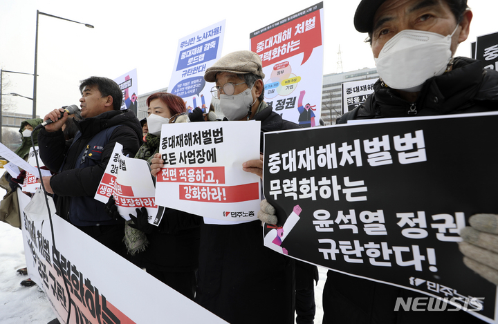 [서울=뉴시스] 최진석 기자 = 26일 서울 용산 대통령 집무실 앞에서 열린 '중대재해 처벌 무력화하는 윤석열 정권 규탄 기자회견'에서 민주노총 관계자들이 중대재해 처벌 무력화 규탄 메시지가 적힌 피켓을 들고 있다. 2023.01.26. photo@newsis.com |