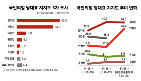 27일 리얼미터가 공개한 여론조사(미디어트리뷴 의뢰, 25~26일, 전국 만 18세 이상 남녀 1009명 대상(국민의힘 지지층은 422명), 자동응답 방식 조사)에 따르면 김 의원은 국민의힘 지지층으로부터 지난주 조사보다 0.3%포인트 하락한 40.0%, 안 의원은 16.7%포인트 오른 33.9%를 기록했다. 두 후보는 오차범위 내(±4.8%) 접전 양상으로 접어든 모양새다.