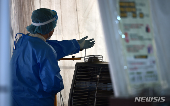 [대구=뉴시스] 이무열 기자 = 5일 오전 대구 수성구보건소 코로나19 PCR 선별진료소에서 한 의료진이 난로에 손을 녹이고 있다. 2023.01.05. lmy@newsis.com |