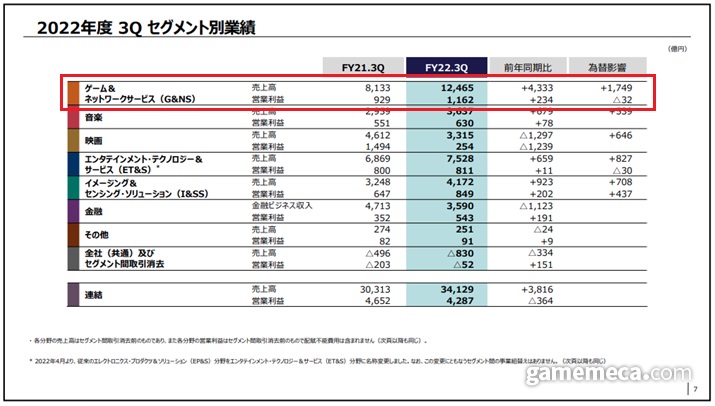 ▲ 소니 2022년 10~12월 실적, 붉은 박스 안이 게임사업 (자료출처: 소니 IR) |