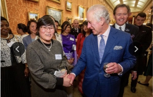 영국 찰스 3세 국왕과 악수하는 탈북민 박지현(53) 씨 |