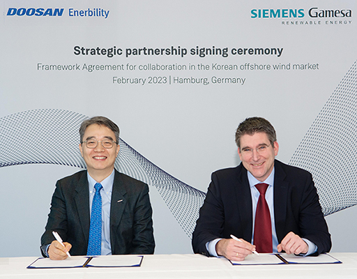 South Korea’s Doosan Enerbility Co. signed a binding framework agreement with Siemens Gamesa Renewable Energy S.A., a global leader in wind power solutions, for a strategic partnership in South Korea’s offshore wind market.
