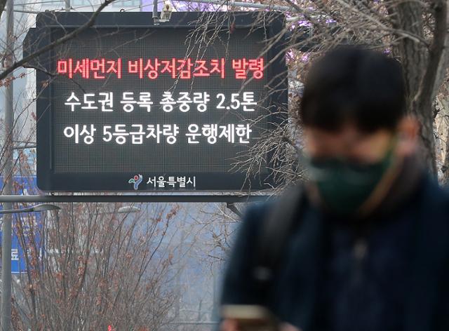 서울 등 수도권과 세종·충청·강원 영서 지역에 미세먼지 비상저감조치가 내려진 7일 오전 서울시청 인근 전광판에 5등급차량 운행제한 안내가 표시돼 있다. 뉴스1 |