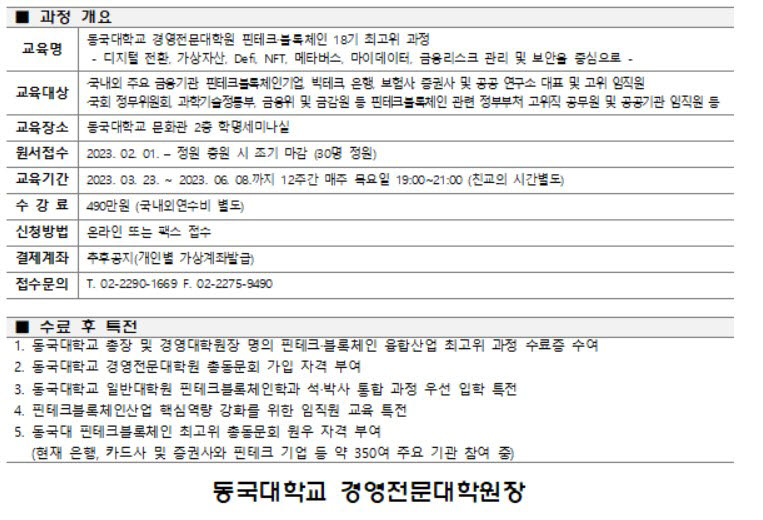 아울러 명예원우 및 강사로 참여하는 금융위원회와 금융감독원, 언론 매체, 핀테크 연구기관 등 스마트 금융분야 정부 및 공공기관과의 교류를 통해 정부와 공공정책 기조 및 동향도 파악할 수 있다. 과정 수료자는 국내 최초로 동국대학교 대학원에 개설되는 핀테크블록체인 석박사 통합과정 입학 특전이 주어진다.
