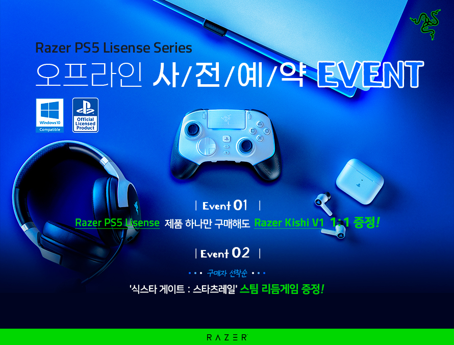 레이저 PS 라이선스 제품 사전 예약 이벤트는 2월 8일부터 23일까지 서울시 용산 전자랜드 4층에 위치한 게임전문 매장 랜드모아와 위브엔터테인먼트 게임몰 등 오프라인 매장과 게임몰 온라인숍에서 진행된다.
