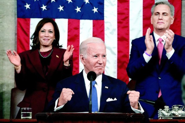 조 바이든 미국 대통령(가운데)이 7일 워싱턴 의회에서 취임 후 두 번째 국정연설을 한 후 두 주먹을 불끈 쥐고 있다. 그는 이날 집권 민주당을 상징하는 푸른 넥타이를 매고 경제 성과를 집중 부각했다. 카멀라 해리스 부통령(왼쪽), 야당 공화당 소속인 케빈 매카시 하원의장이 박수를 치며 지켜보고 있다. 워싱턴=AP 뉴시스 |