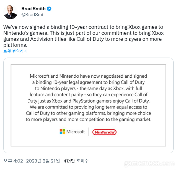▲ 닌텐도와의 10년 게임 제공 계약에 대한 MS 브래드 스미스 사장의 트윗 (자료출처: MS 브래드 스미스 사장 트위터) |