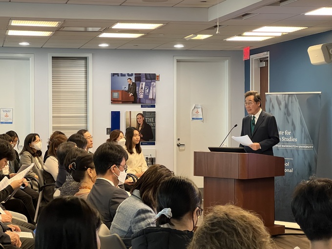 이날 강연에는 조지워싱턴대 학생들과 교직원 등 150여명이 모여 강연장이 가득 찼다. 최근 북한의 미사일 도발 등이 이어지면서 강연 시작 전부터 온라인 등을 통해 이 전 총리에게 사전 질문만 30개가 넘게 들어왔다고 한국학연구소는 설명했다.