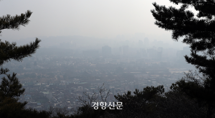 지난 6일 서울 인왕산에서 바라본 서울 시내가 뿌옇게 뒤덮여 있다. 서성일 선임기자 |