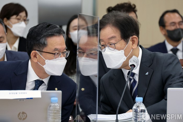 [서울=뉴스핌] 국회사진취재단 = 이재명 더불어민주당 대표가 4일 오전 서울 용산구 국방부에서 열린 국회 국방위원회 국정감사에서 정성호 의원과 대화를 하고 있다. 2022.10.04 photo@newspim.com |
