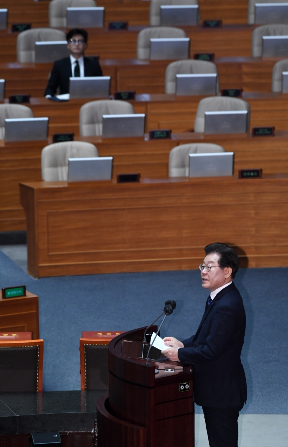 이재명 더불어민주당 대표가 27일 오후 서울 여의도 국회 본회의장에서 열린 제403회국회(임시회) 제8차 본회의에서 본인의 체포동의안에 대한 신상 발언을 하고 있다. 2023.02.27. 도준석 기자 |