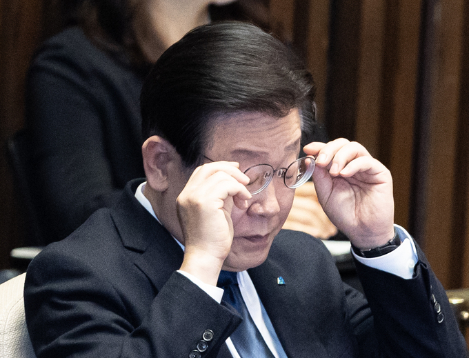 이재명 더불어민주당 대표가 27일 오후 서울 여의도 국회에서 열린 제403회 국회(임시회) 제8차 본회의에서 안경을 고쳐쓰고 있다. 뉴스1 |