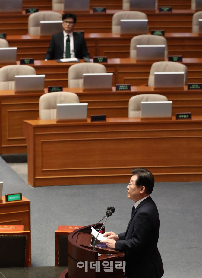 이재명 더불어민주당 대표가 27일 서울 여의도 국회에서 열린 제403회국회(임시회) 제8차 본회의에서 체포동의안에 대한 신상 발언을 하고 있다. (사진=이데일리 노진환 기자) |