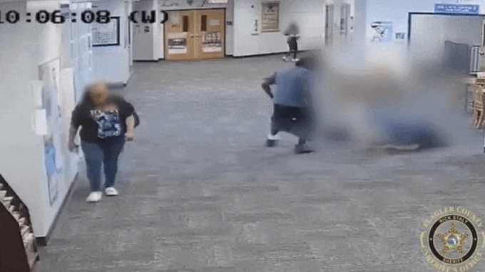 미국 플로리다주(州) 플래글러 카운티의 한 고등학교에서 벌어진 학생의 교직원 폭행 사건 감시 카메라 영상 캡처. /사진=플래글러 카운티 경찰당국 |