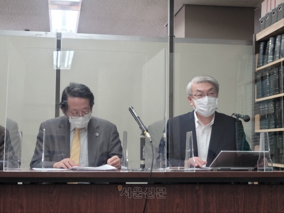 강제동원 가해 기업에 사죄 요구하는 일본 변호사들 - 일본 시민단체와 변호사 등이 28일 도쿄지방법원 기자회견장에서 기자회견을 열고 일제강점기 강제동원 가해 기업인 미쓰비시중공업과 일본제철에 배상과 사죄를 요구하고 있다. 도쿄 김진아 특파원 |