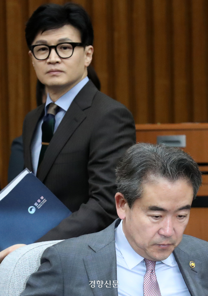 한동훈 법무부장관(위)과 윤희근 경찰청장이 28일 국회에서 열린 중대 민생침해 금융범죄 대응방안 및 금융부담완화대책 민.당.정 협의회에 참석해 자리에 앉고 있다. 박민규 선임기자 |