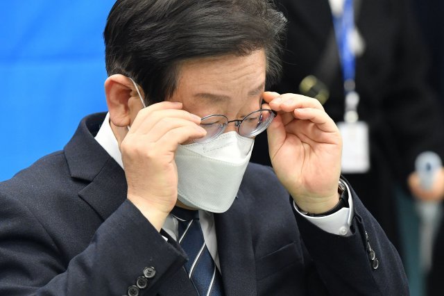 이재명 더불어민주당 대표가 지난달 28일 오전 서울 은평구 수색초등학교에서 열린 학교 급식노동자 폐암 진단 관련 민생현장 방문 간담회에 참석해 안경을 고쳐쓰고 있다. 뉴스1 |