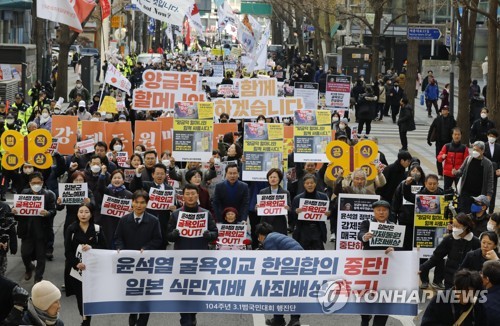 (서울=연합뉴스) 설하은 기자 = 611개 시민사회단체로 구성된 한일역사정의평화행동은 1일 오후 서울시청 앞에서 '제104주년 3·1 범국민대회'를 하고 강제징용 문제와 관련한 한일합의 추진을 중단하라고 촉구했다.