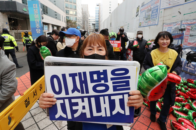 이재명 더불어민주당 대표의 지지자들로 구성된 수박깨기운동본부 회원들이 지난 3일 서울 여의도 더불어민주당사 앞에서 이 대표의 체포 동의안 부결 관련 이탈표 규탄 집회를 하고 있다. 수박은 은어로 겉은 더불어민주당(파란색)이지만 속은 국민의힘(빨간색)이라는 뜻이다. 뉴스1 |
