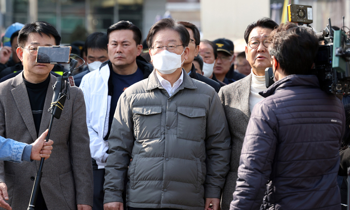 화재 현장 방문 더불어민주당 이재명 대표가 5일 인천 동구 현대시장 화재 현장을 찾아 피해 상황을 살피고 있다. 연합뉴스 |