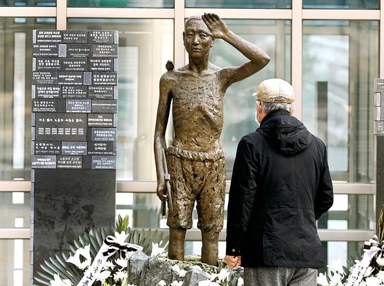 한 시민이 5일 서울 용산역광장에서 강제징용노동자상을 보고 있다. 뉴스1 |