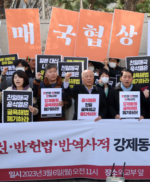 한일역사정의평화행동 활동가들이 6일 서울 종로구 정부서울청사 별관 외교부 앞에서 윤석열 정부 강제동원 굴욕해법 발표 강행 규탄 기자회견을 하고 있다. (사진=이데일리 방인권 기자) |