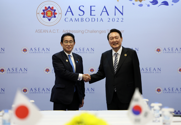 윤석열 대통령이 13일(현지시간) 프놈펜 한 호텔에서 기시다 후미오 일본 총리와 한일 정상회담에 앞서 악수를 하고 있다. 2022.11.13. [사진=뉴시스] |