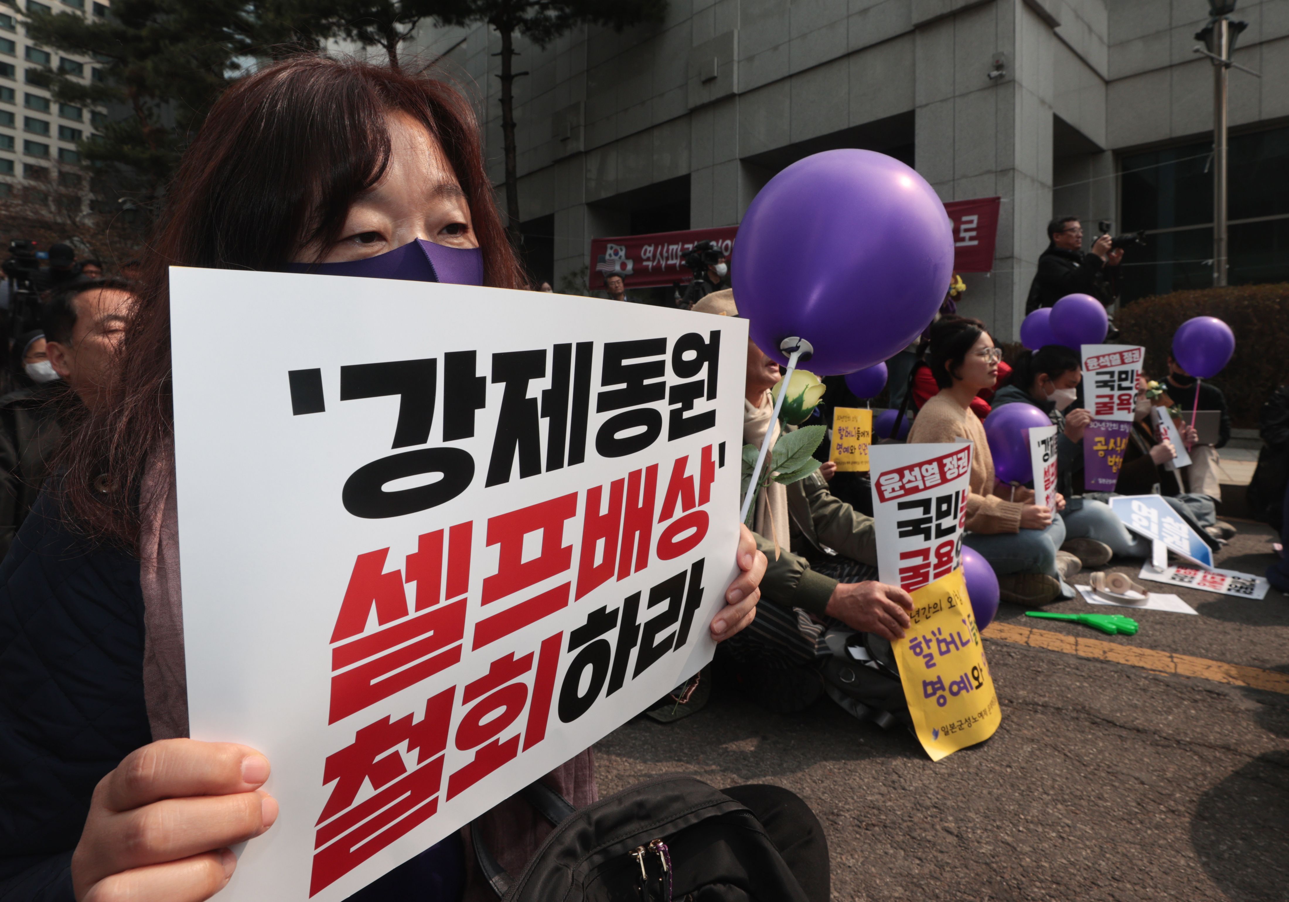 8일 오후 서울 종로구 옛 일본대사관 인근에서 열린 일본군 성노예제 해결을 위한 제1586차 수요시위에서 참가자들이 지난 6일 정부가 발표한 강제징용 관련 정부안에 반대하는 팻말을 들고 있다. 2023.3.8 /연합뉴스 |