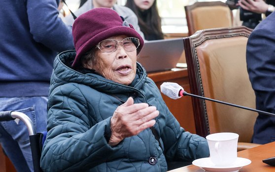 일제 강제동원 피해자 양금덕 할머니가 13일 서울 여의도 국회에서 열린 외교통일위원회 전체회의에 참고인으로 출석해 발언하고 있다. 김성룡 기자 |