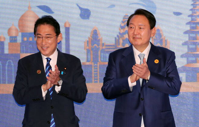 윤석열 대통령이 지난해 11월 12일(현지시간) 오전 캄보디아 프놈펜 한 호텔에서 열린 아세안(ASEAN·동남아국가연합)+3(한중일) 정상회의에 참석, 기시다 후미오 일본 총리와 기념촬영을 하고 있다. [연합] |