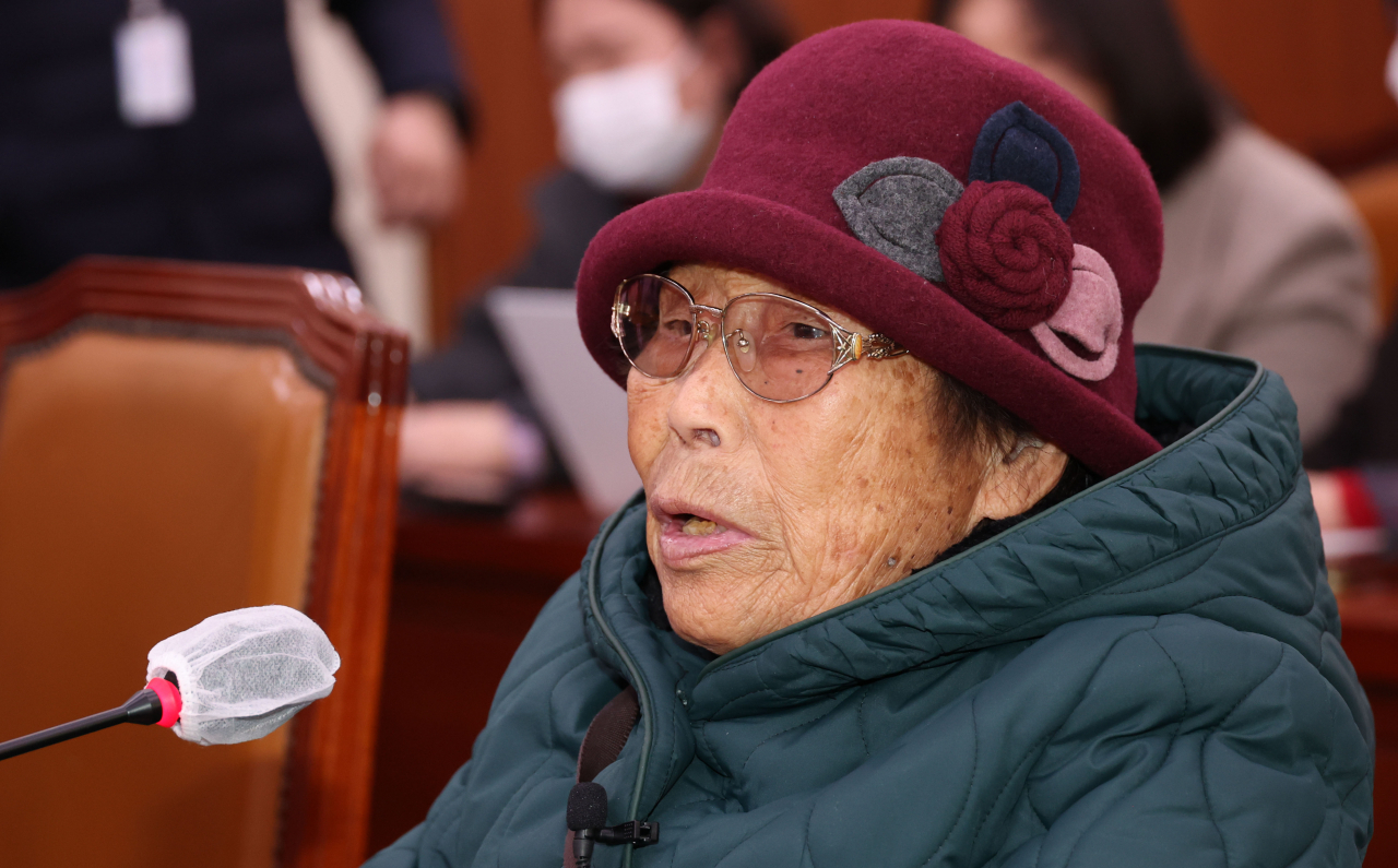 강제징용 피해자 양금덕 할머니가 지난 13일 오전 서울 여의도 국회에서 외교통일위원회 전체회의에서 긴급현안질의 참고인으로 출석해 발언하고 있다. [연합] |