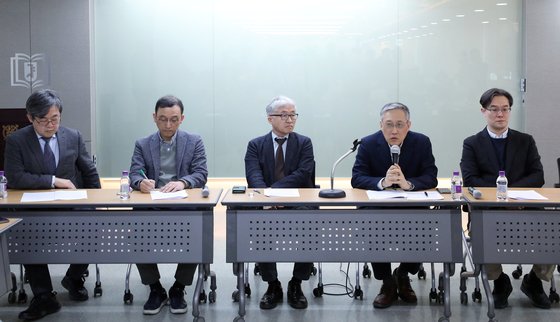 서울대학교민주화교수협회의 이준호 생명과학부 교수(왼쪽부터)와 김백영 사회학과 교수, 김명환 의장(영문과 교수), 남기정 일본연구소 교수, 이동원 국사학과 교수가 14일 오전 서울 관악구 서울대학교 관정관 별관동에서 윤석열 정부의 일제 강제동원 판결 관련 해법에 대한 비판 성명서 발표 및 기자 간담회를 하고 있다. 뉴스1 |