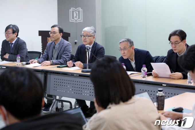 (서울=뉴스1) 박정호 기자 = 서울대학교민주화교수협회의 이준호 생명과학부 교수(왼쪽부터)와 김백영 사회학과 교수, 김명환 의장(영문과 교수), 남기정 일본연구소 교수, 이동원 국사학과 교수가 14일 오전 서울 관악구 서울대학교 관정관 별관동에서 윤석열 정부의 일제 강제동원 판결 관련 해법에 대한 비판 성명서 발표 및 기자 간담회를 하고 있다. 서울대학교민주화교수협회의는 현 정부의 강제동원 해법은 해법이 될 수 없고 오히려 새로운 문제와 갈등의 출발점이 될 뿐이라며, 즉시 철회할 것을 촉구했다. 2023.3.14/뉴스1 Copyright (C) 뉴스1. All rights reserved. 무단 전재 및 재배포 금지. |
