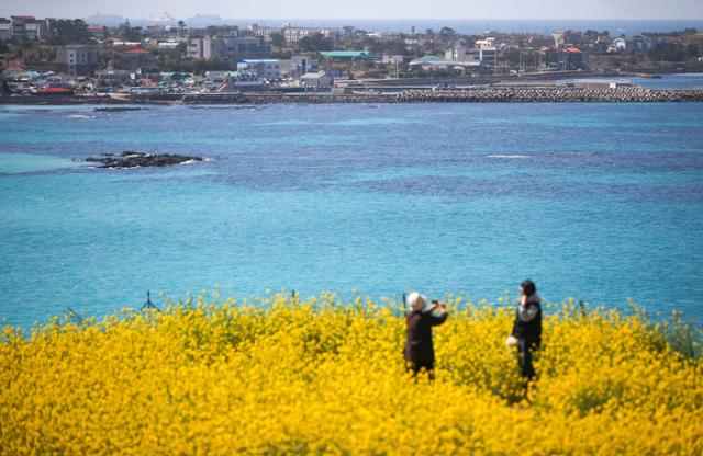 꽃샘추위가 누그러진 14일 오후 제주시 조천읍 함덕해변 인근 서우봉 유채꽃밭을 찾은 관광객들이 봄 정취를 만끽하고 있다. 제주=뉴시스 |