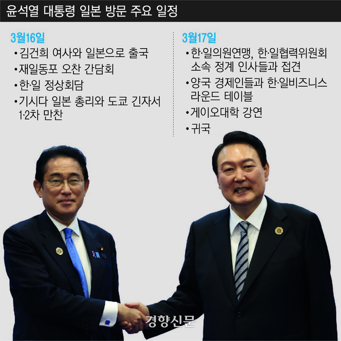 기시다 총리는 16일 윤 대통령과의 회담에서 셔틀 외교 재개를 확인할 방침이다.