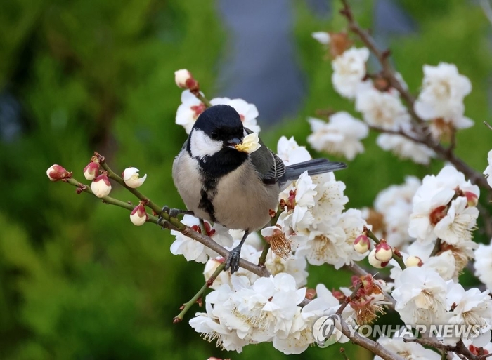 15일 강원 강릉시 초당동 한 공원의 활짝 핀 매화나무에서 박새가 벌과 꿀 등 먹이를 찾고 있다. [자료=연합뉴스] |