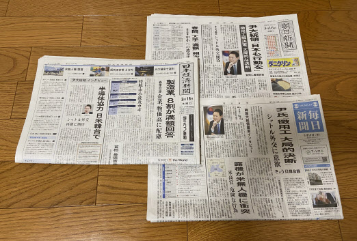일본 아사히신문, 마이니치신문, 니혼게이자이신문은 한일 정상회담이 열리는 16일 조간신문 1면에 윤석열 대통령 인터뷰 기사를 실었다. 윤 대통령은 인터뷰에서 “강제징용 문제 해결은 한국 정부가 국익의 관점에서, 국민을 위해 대국적 차원에서 내린 결단”이라며 일본도 행동에 나서야 한다고 강조했다.(사진=연합뉴스) |