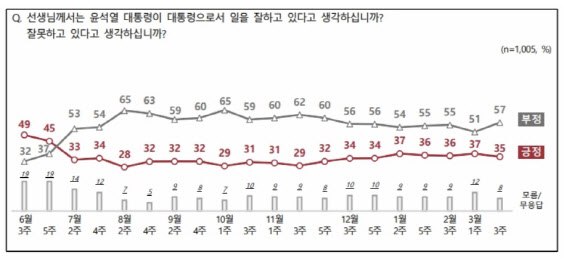 엠브레인퍼블릭, 케이스탯리서치, 코리아리서치, 한국리서치가 지난 13일부터 15일까지 전국 만 18세 이상 남녀 1005명을 대상으로 조사한 결과 윤 대통령의 국정운영을 긍정평가한 응답률은 35%로 집계됐다. 이는 직전 조사와 비교해 2%포인트 감소한 수치다. 반면 같은 기간 부정평가는 6%포인트 급등한 57%를 기록했다.