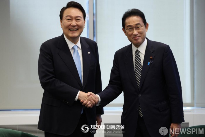 [서울=뉴스핌] 윤석열 대통령과 기시다 후미오 일본 총리. [사진=대통령실] 2022.09.22 photo@newspim.com |