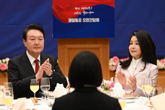 1박 2일간의 일정으로 일본을 방문한 윤석열 대통령과 김건희 여사가 16일 도쿄 한 호텔에서 열린 재일동포 오찬 간담회에서 박수치고 있다. (사진=연합뉴스) |
