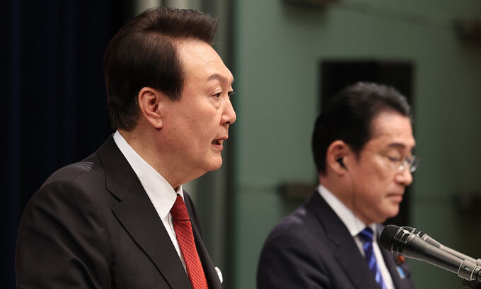 1박2일 일정으로 일본을 방문한 윤석열 대통령이 16일 일본 도쿄 총리 관저에서 기시다 후미오 일본 총리와 공동 기자회견을 하고 있다. 연합뉴스 |