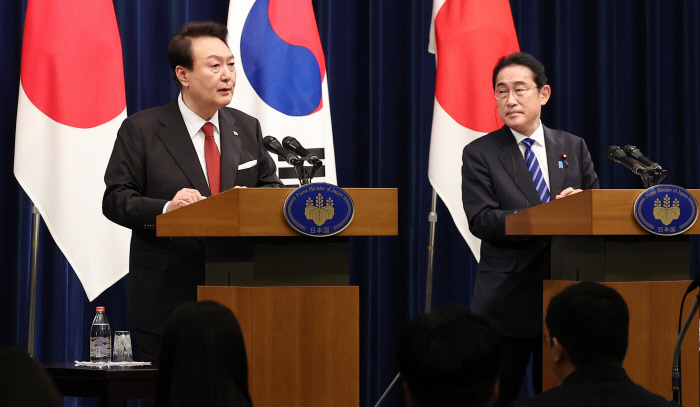 윤 대통령은 회담 뒤 공동 회견에서 “이번 회담은 ‘김대중-오부치 공동선언’의 정신을 발전적으로 계승하여 양국 간 불행한 역사를 극복하고 한·일 간 협력의 새 시대’를 여는 첫걸음이 됐다”며 협력 강화를 말했다. 기시다 총리도 “1965년 국교 정상화 관계 이후 한·일관계를 앞으로 더욱더 발전시켜나가도록 함께 의견을 모았다”면서 “윤 대통령의 일본 방문은 한·일관계의 매우 큰 발자취가 될 것”이라고 했다.
