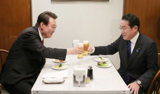 윤석열 대통령과 기시다 후미오 일본 총리가 16일 친교 만찬을 마치고 도쿄 한 식당으로 자리를 옮겨 맥주를 건배하고 있다. 도쿄=뉴시스 |