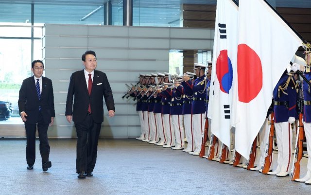 尹, 日총리관저서 자위대 의장대 사열 한일 정상회담 참석을 위해 일본을 방문한 윤석열 대통령이 16일 오후 일본 도쿄 총리관저에서 기시다 후미오 일본 총리와 자위대 의장대를 사열하고 있다. 도쿄=뉴시스 |